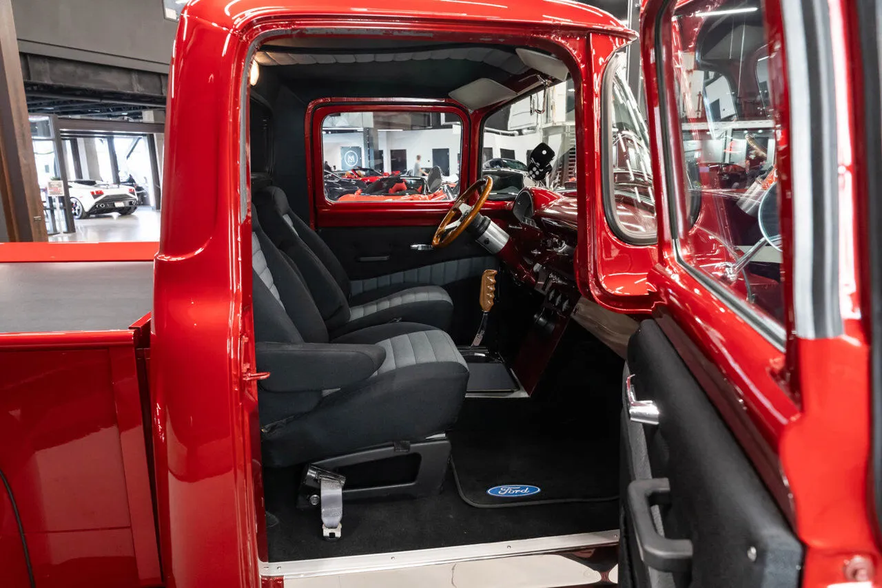 1956 Ford F-100 Custom Show Truck in red over black, powered by a 302 Ford small block and automatic transmission.