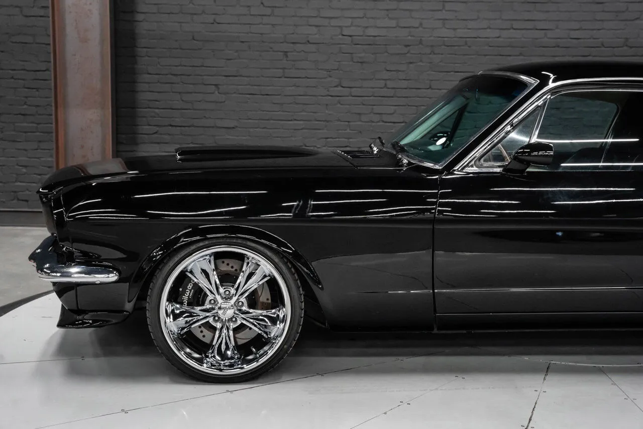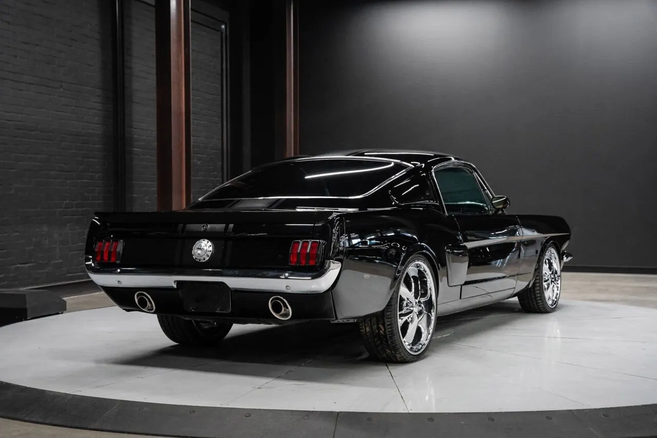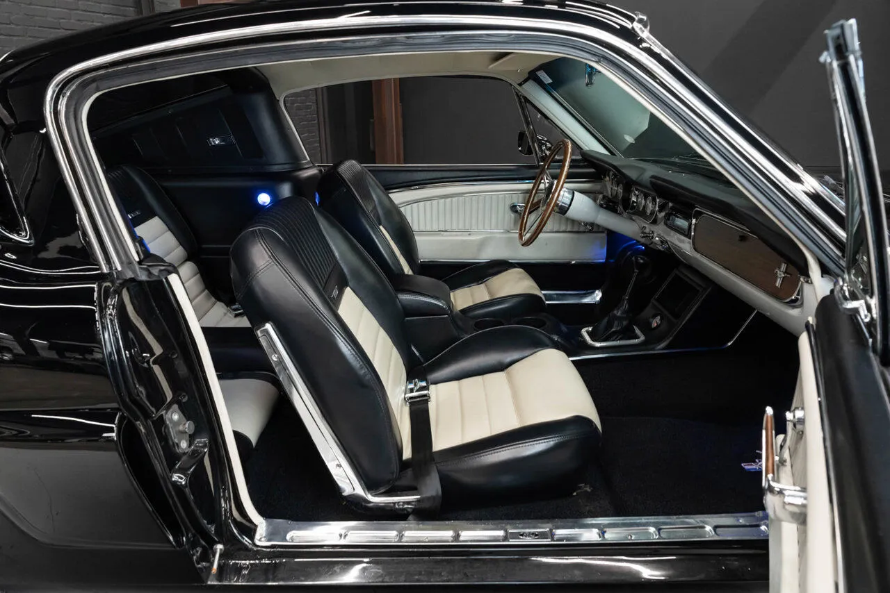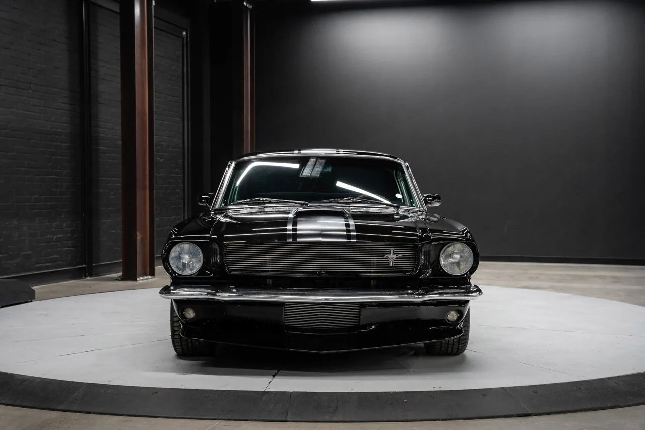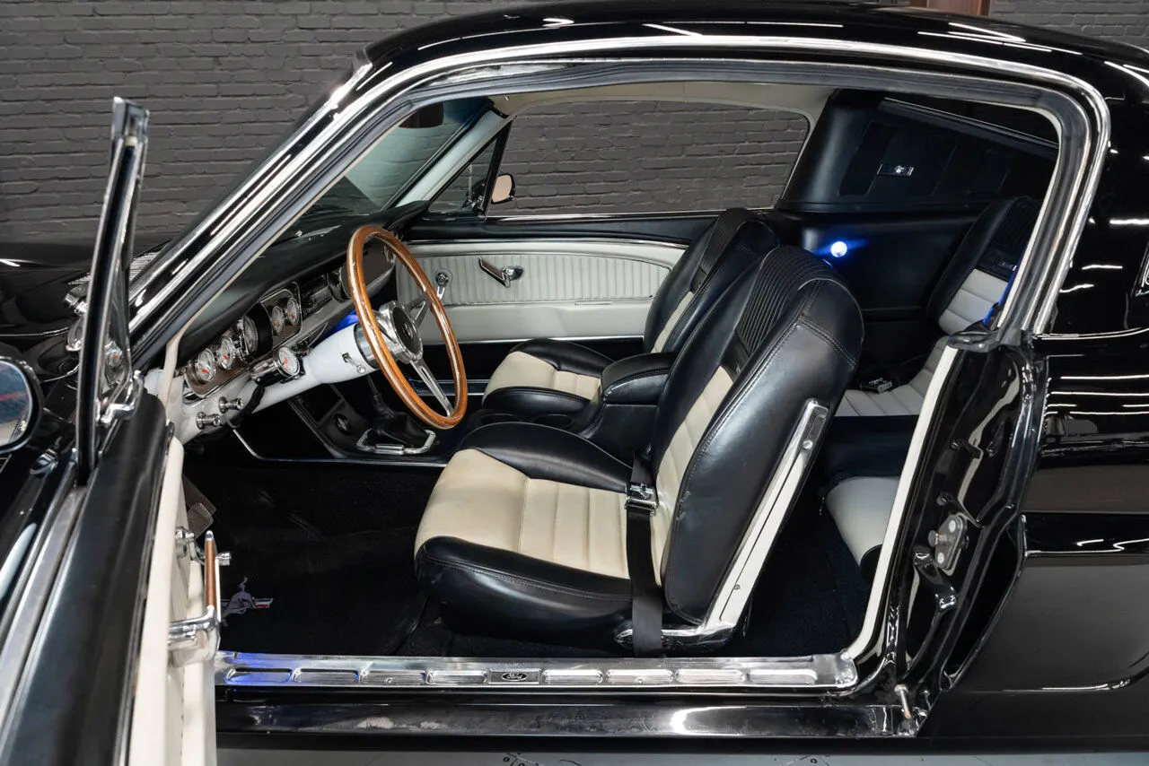 1965 Ford Mustang finished in black with black/white interior, powered by a 347 Stroker and automatic transmission.