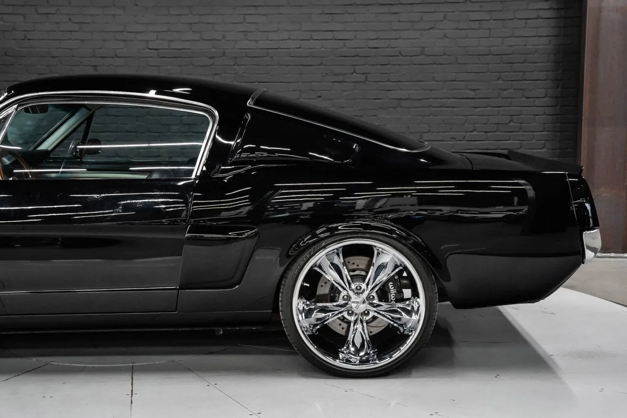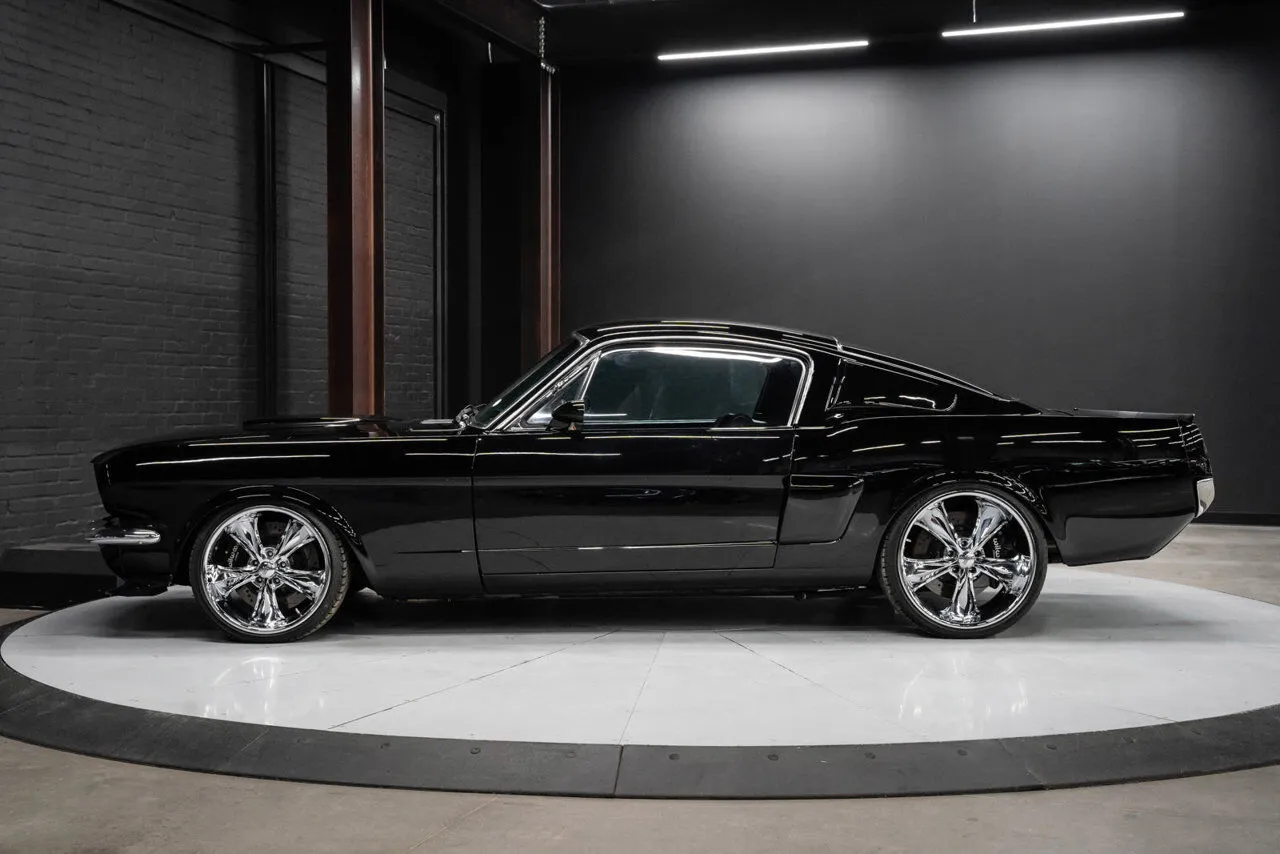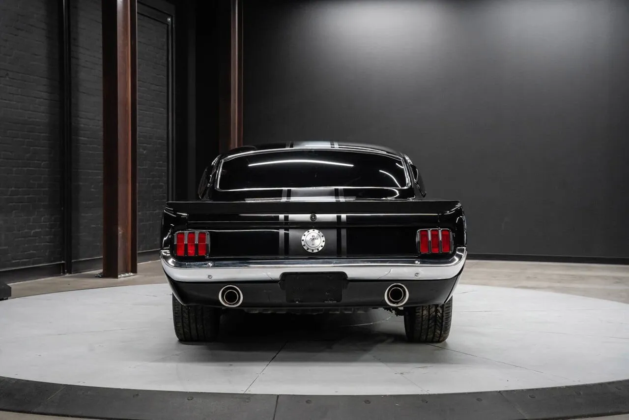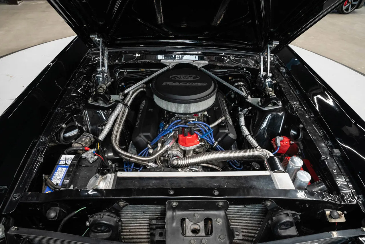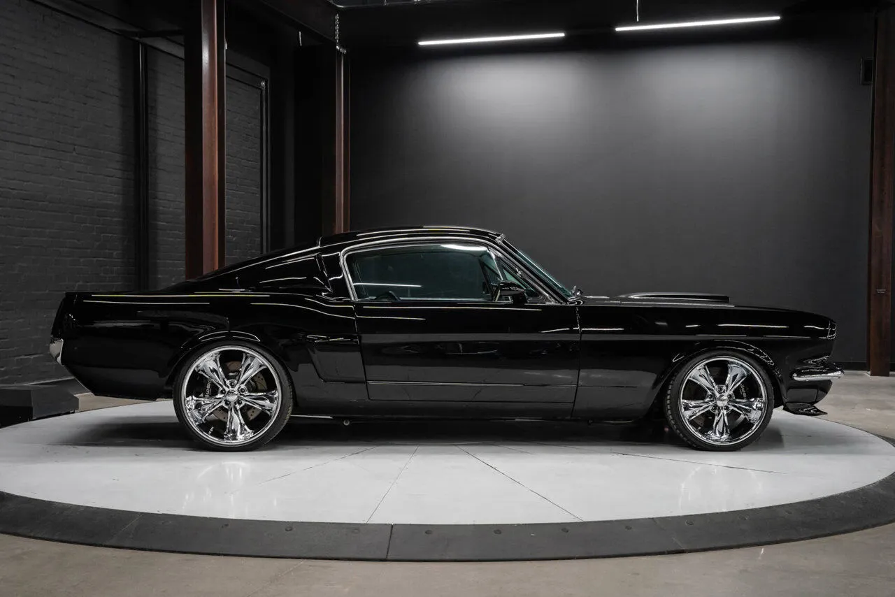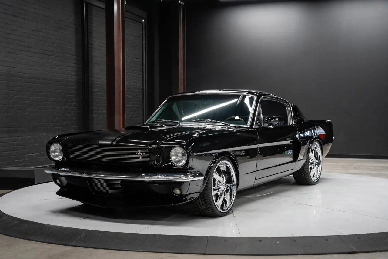 1965 Ford Mustang finished in black with black/white interior, powered by a 347 Stroker and automatic transmission.