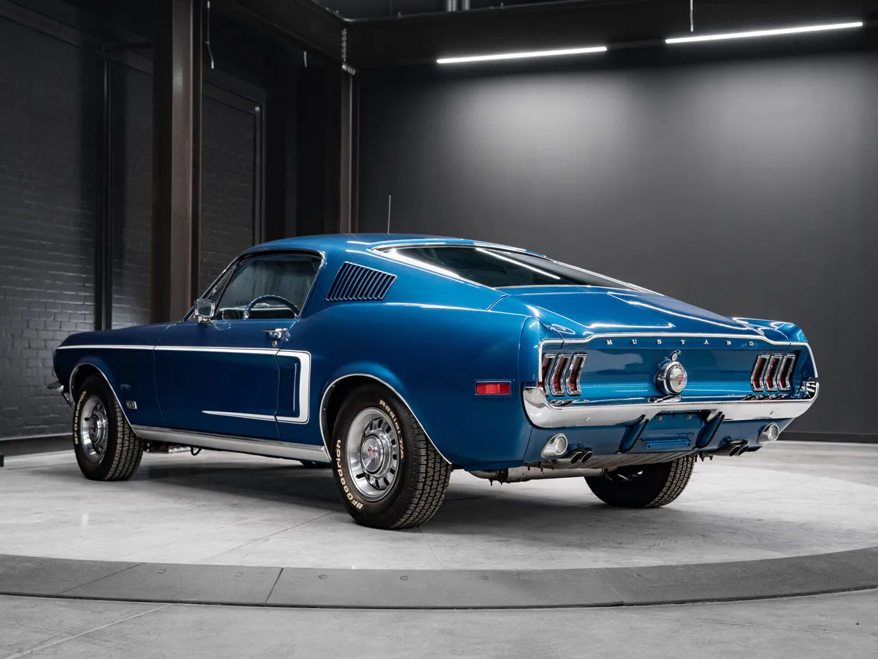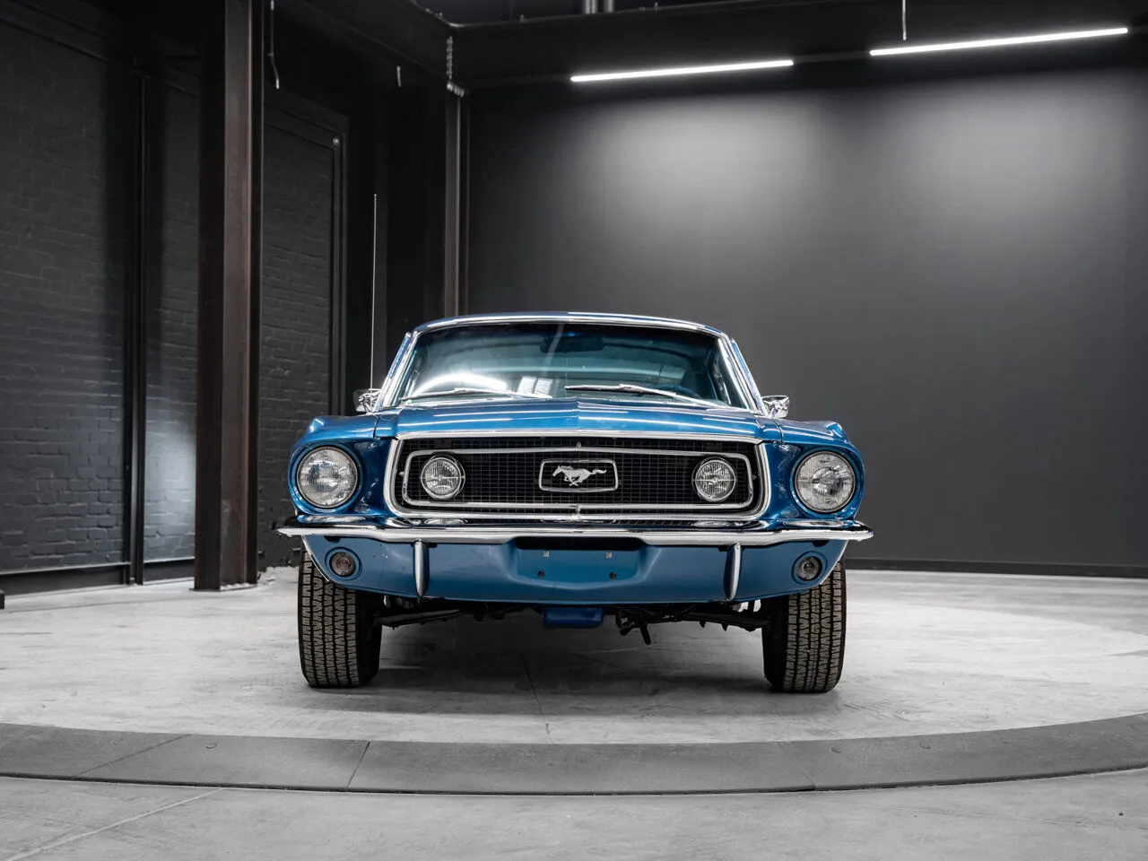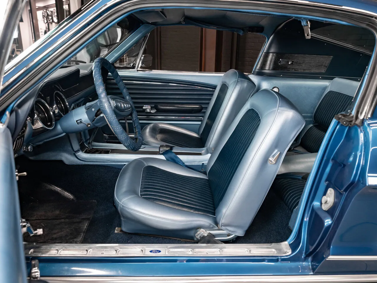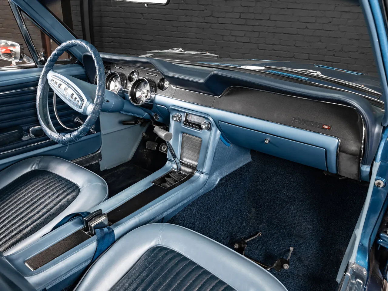 1968 Ford Mustang in blue over blue with rear-wheel drive and manual transmission.