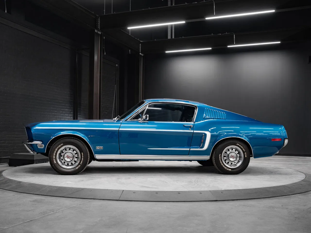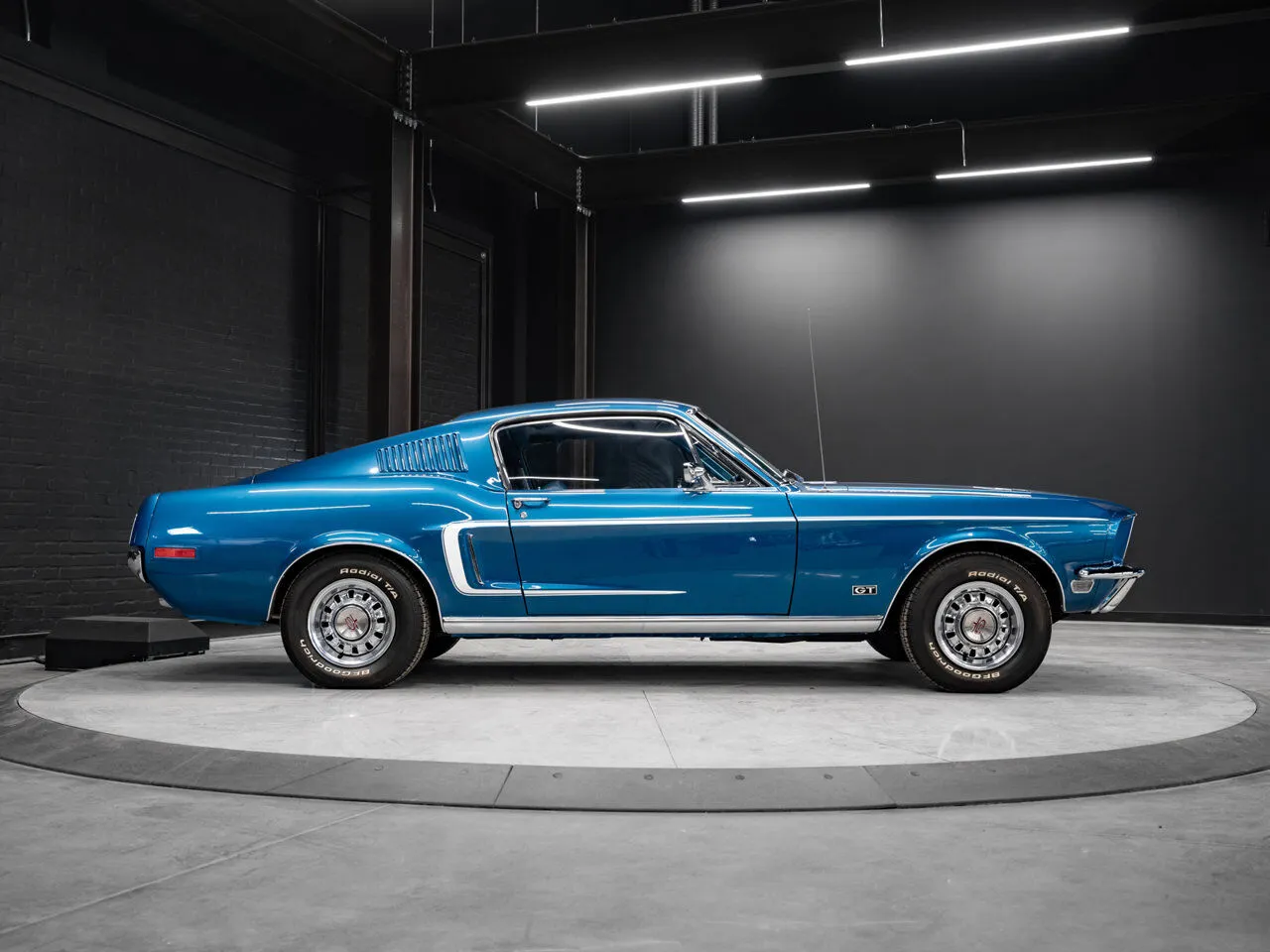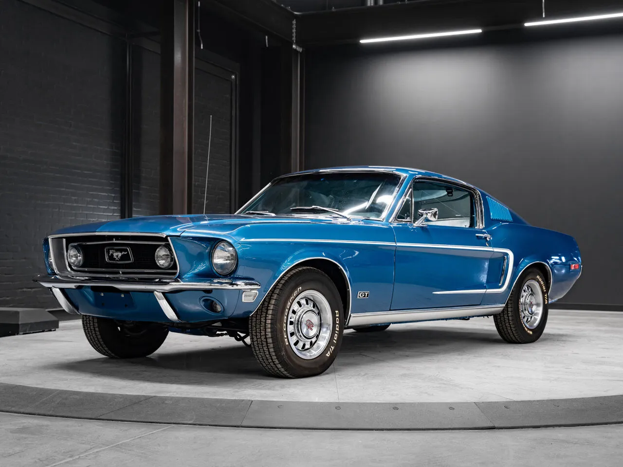 1968 Ford Mustang in blue over blue with rear-wheel drive and manual transmission.