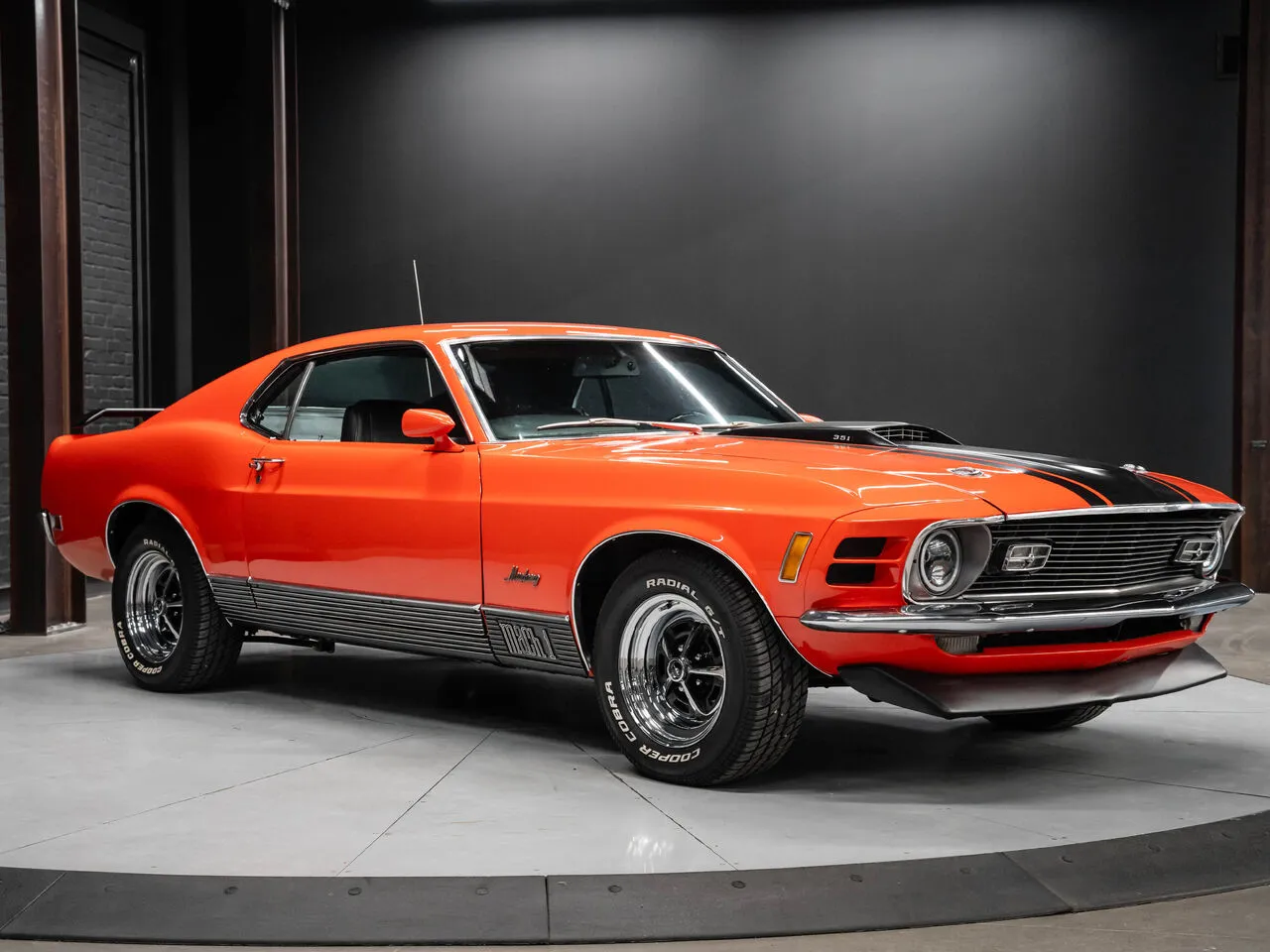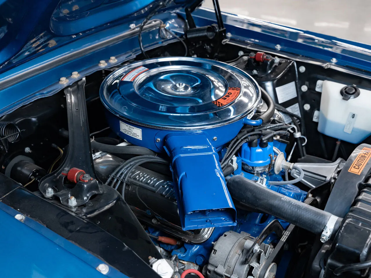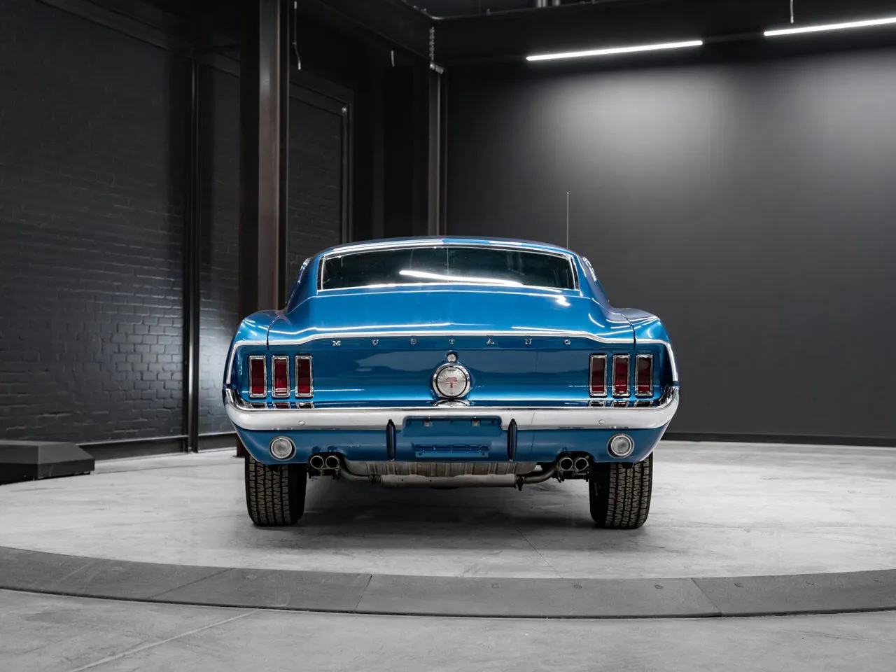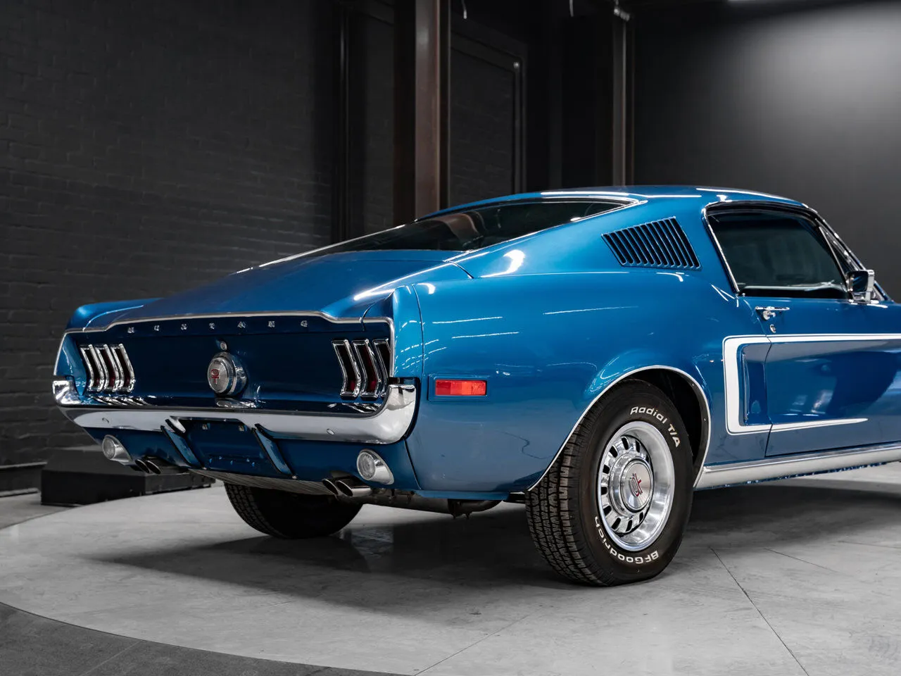 1968 Ford Mustang in blue over blue with rear-wheel drive and manual transmission.