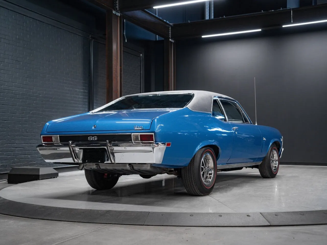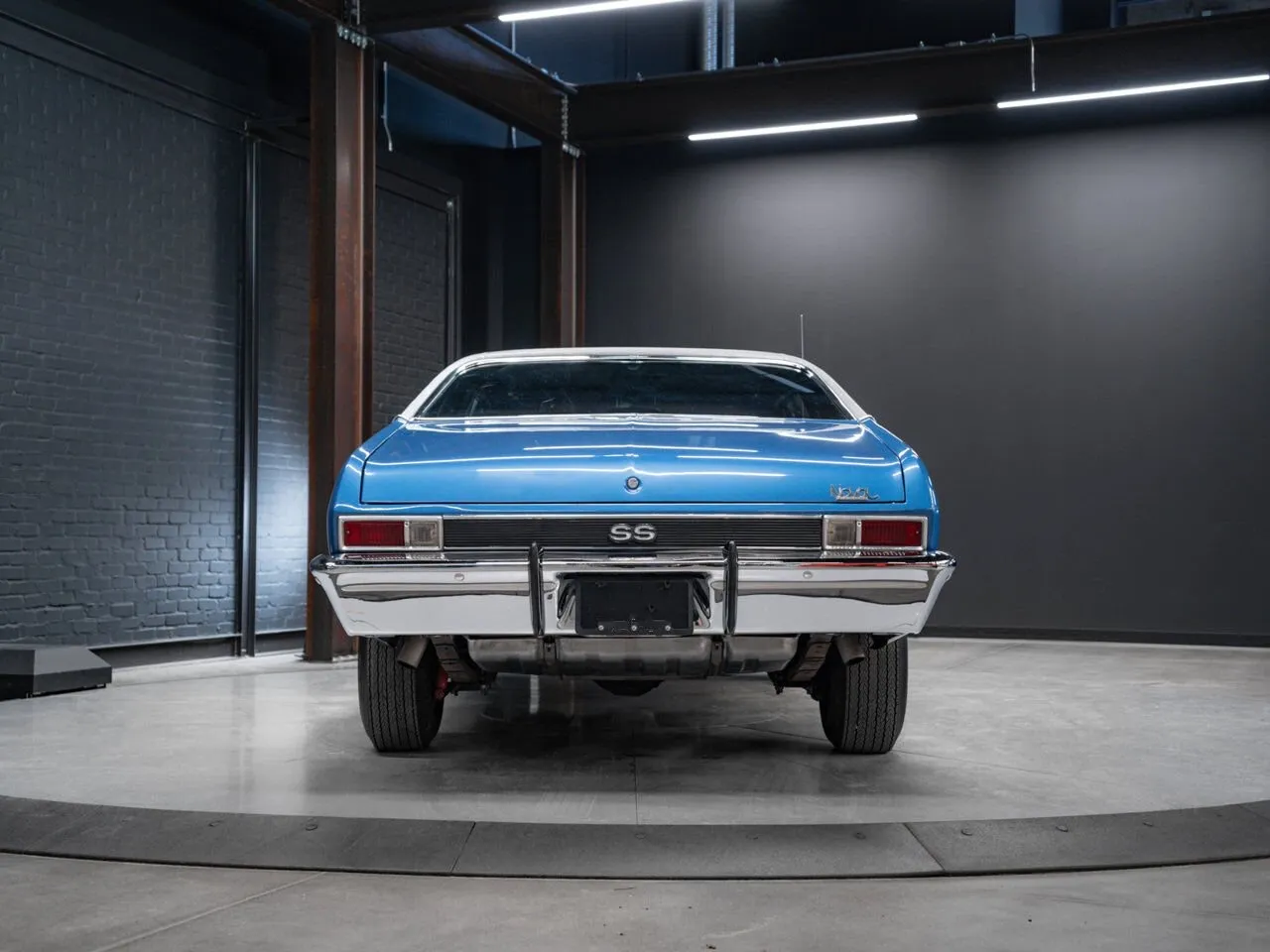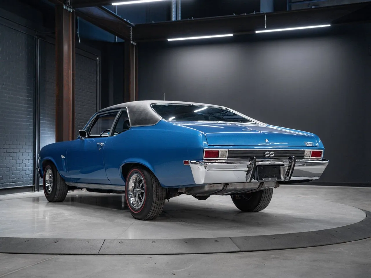 1969 Chevrolet Nova SS 396 finished in blue over black, powered by a 396 cu. in. V8 and manual transmission.